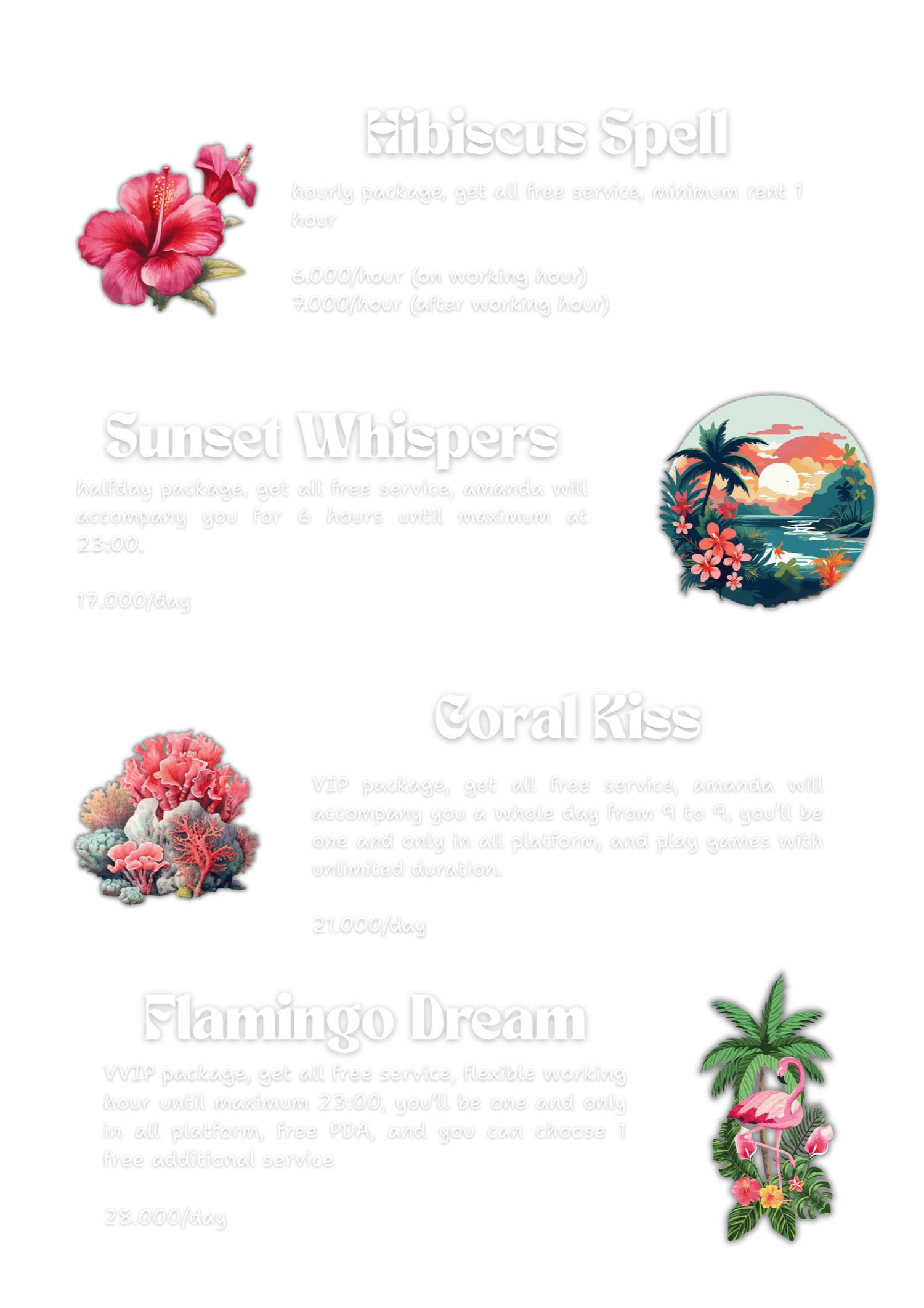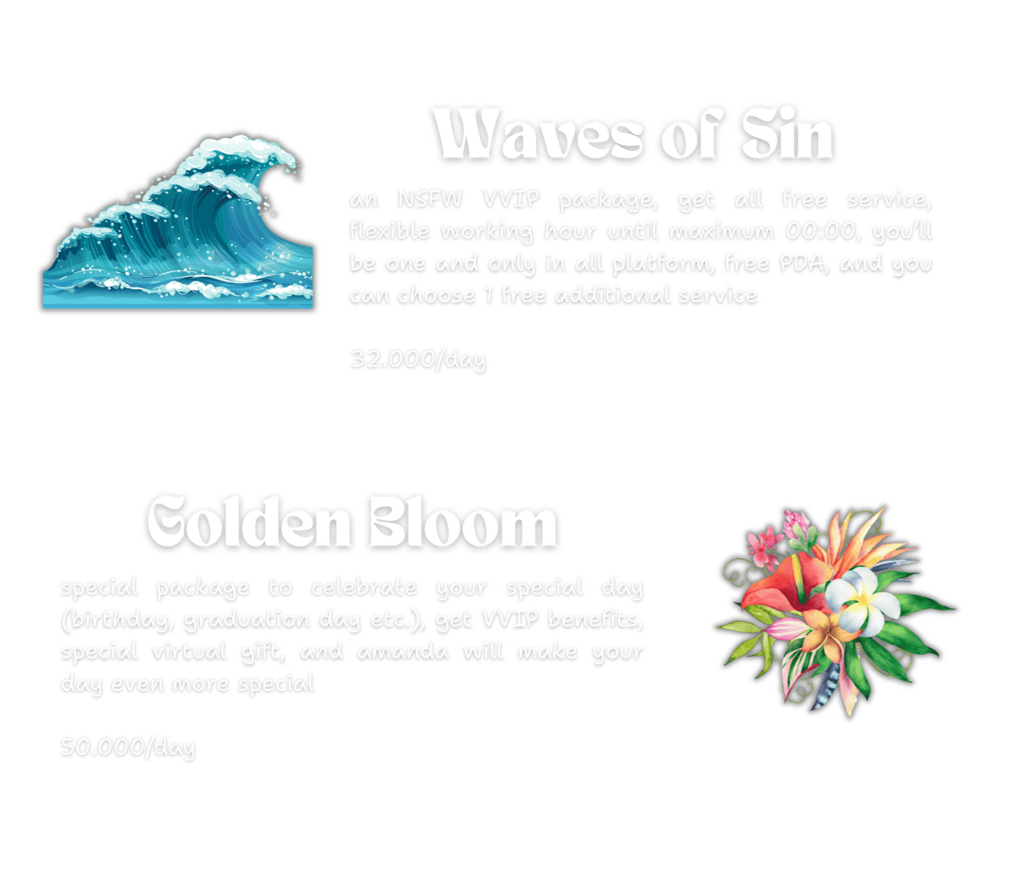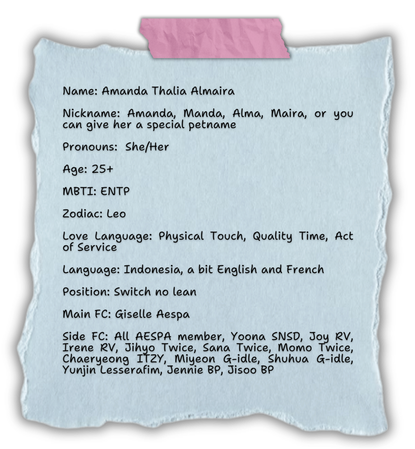 1. Amanda’s working hour is 9 to 9 GMT+7 (WIB)2. Amanda is available for BxG, GxB, GxNB, GxG, Mommy, Bestfriend, Daughter, and Sibling.3. NSFW service is available for BxG and GxG, Amanda only provide dity talk and imagine (strictly in Bahasa Indonesia). You must be (at least) 22+. Please be honest about your real age4. Available on telegram, twitter, imess, kakaotalk, and instagram (soon!)5. Available for ca/ba/fa/rant/rp. Pa/alter will be blocked permanently6. Unfortunately, amanda is not provide otp/vn service for now, but feel free to send voice notes to her7. Please do not reply to Amanda's messages if she's still typing8. Please fill the form clearly and do the payment first right after she agree to meet you to avoid hit and run9. You are allowed to ask about amanda’s real life activities, but you are strictly prohibited to ask about her personal life, do not cross the line10. Cancel and refund are not allowed, however you are allowed to reschedule the date. You will get the refund if amanda makes mistake11. If amanda away for more than 6 hours without any notice, you are allowed to reschedule the session or apply for a refund. But if you’re away without any reason, the session will be running as it should12. You are allowed to send real life photo (activities, objects, or scenery), but do not send your real face or half body photo to amanda13. Your sweet messages on her padlet will be much appreciated14. Amanda has no responsibilities if you’re catching feelings after rent session15. Secret Code: journey mercies